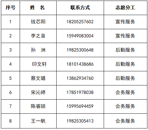 各班: 根据《关于征集校第二届创客冬令营志愿者的通知》要求,经个人申报、学院审核,共有 8 名同学录用为校第二期冬令营志愿者。现将名单公布如下: