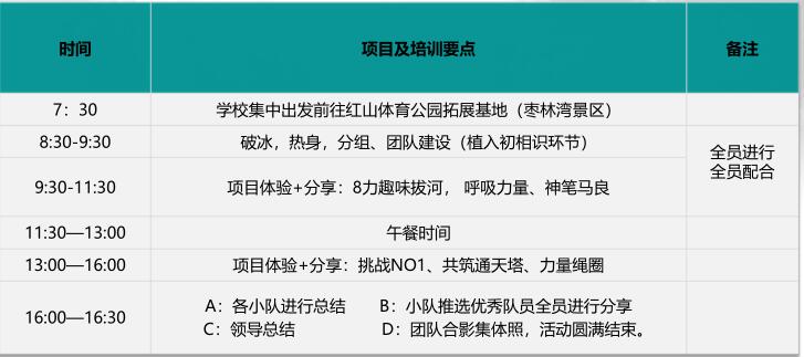本方案以“激情成就梦想 团队创造辉煌”为主题,在项目设计中融入“沟通力、团结力、凝聚力 ”等元素,使参训者完成以下转变:自我认识(团队形成期)—团队意识(团队融合期)—沟通意识(团队突破期)—责任与爱(共创辉煌)”;考虑到是大一新生,培训老师会在活动中,让大家变的熟悉和融洽,同时让大家在集体中找到归属感,这样会对大学生活起到很好的助理作用,活动设计方面我们会让挑战刻骨铭心,让激情肆意挥洒,让感受彼此分享。